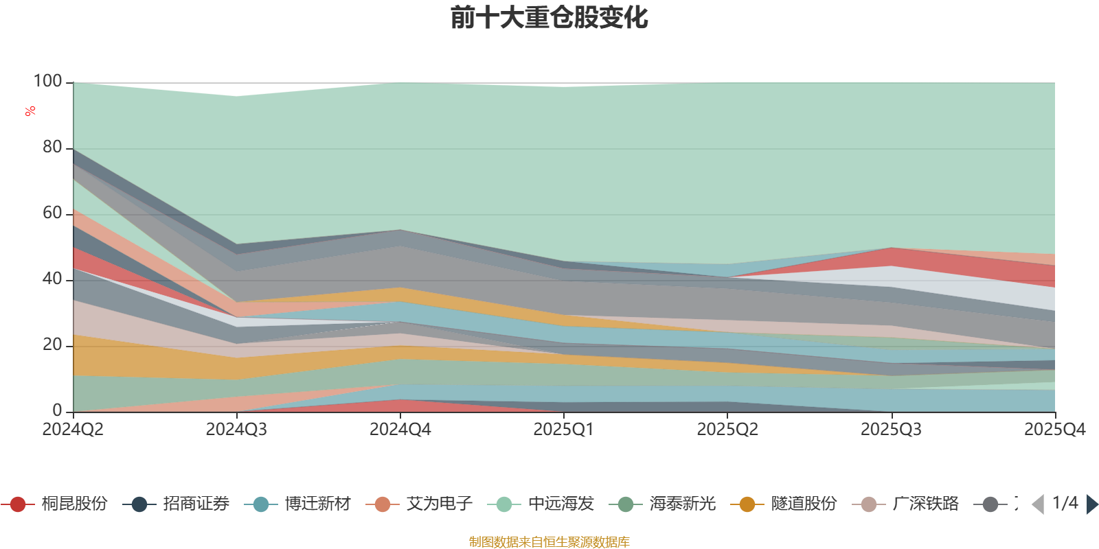 截至2025年末,基金十大重仓股分别是中通快递-W、盛天网络、仙乐健康、博迁新材、海泰新光、继峰股份、隆基绿能、海康威视、中集安瑞科、中远海发。