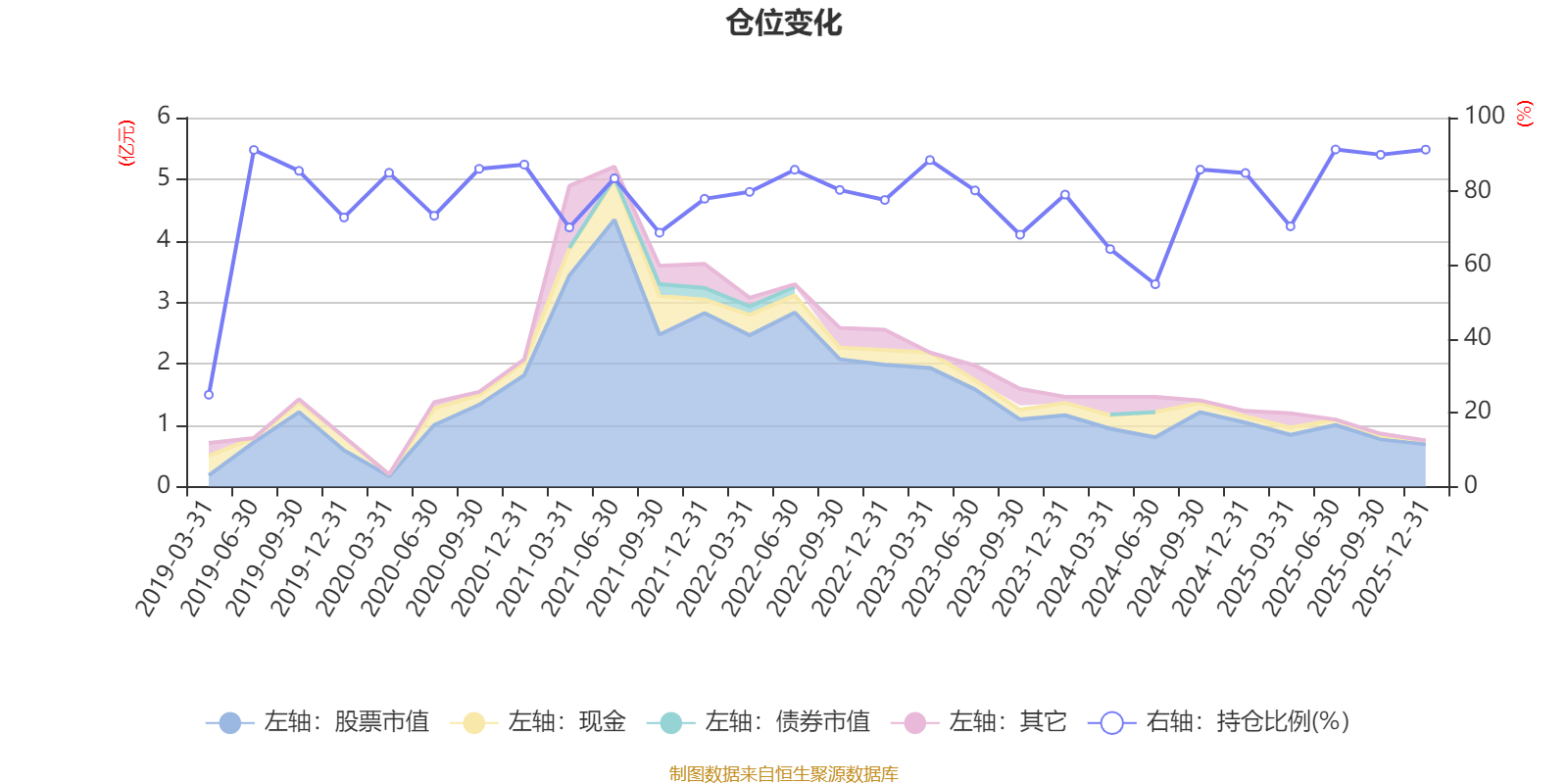 据定期报告数据统计,近三年平均股票仓位为79.11%,同类平均为84.04%。2025年上半年末基金达到91.36%的最高仓位,2019年一季度末最低,为24.89%。