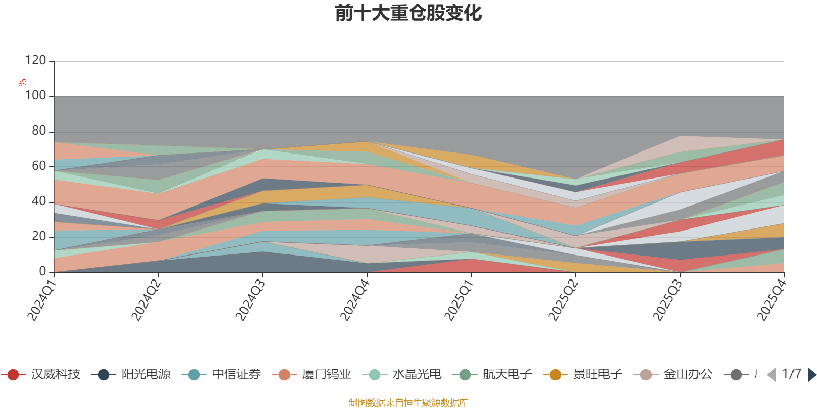该基金持股集中度较高。截至2025年末,基金十大重仓股分别是臻镭科技、中际旭创、比亚迪、航天电子、上海瀚讯、上海港湾、寒武纪、东芯股份、赣锋锂业、厦门钨业。