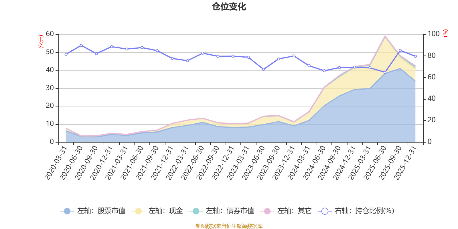 据定期报告数据统计,近三年平均股票仓位为73.16%,同类平均为86.17%。2020年上半年末基金达到89.79%的最高仓位,2025年上半年末最低,为64.76%。