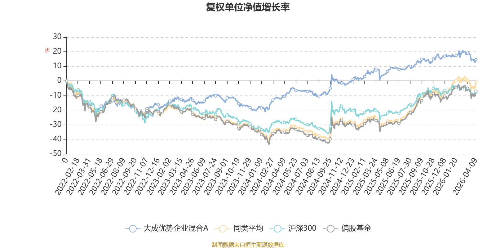 截至4月9日,大成优势企业混合A近三个月复权单位净值增长率为-2.32%,位于同类可比基金75/130;近半年复权单位净值增长率为-0.18%,位于同类可比基金61/130;近一年复权单位净值增长率为12.95%,位于同类可比基金113/130;近三年复权单位净值增长率为31.58%,位于同类可比基金35/126。