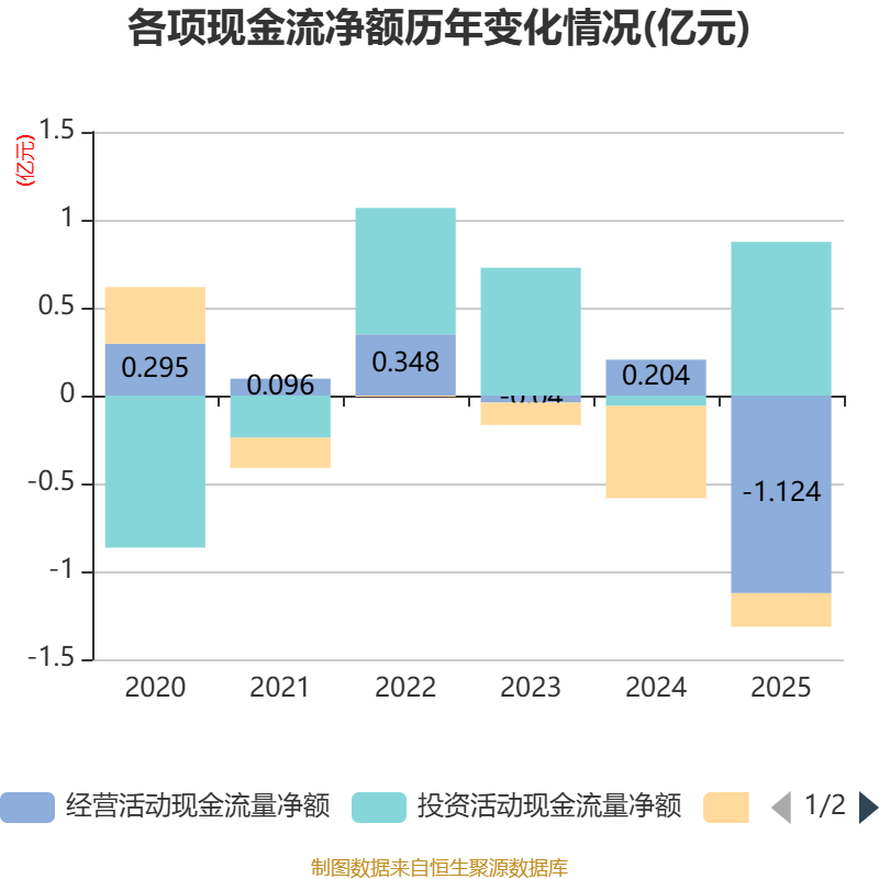 截至2025年,公司经营活动现金流净额为-1.12亿元,同比减少1.33亿元;筹资活动现金流净额-1908.92万元,同比增加3340.04万元;投资活动现金流净额8739.56万元,上年同期为-588.74万元。