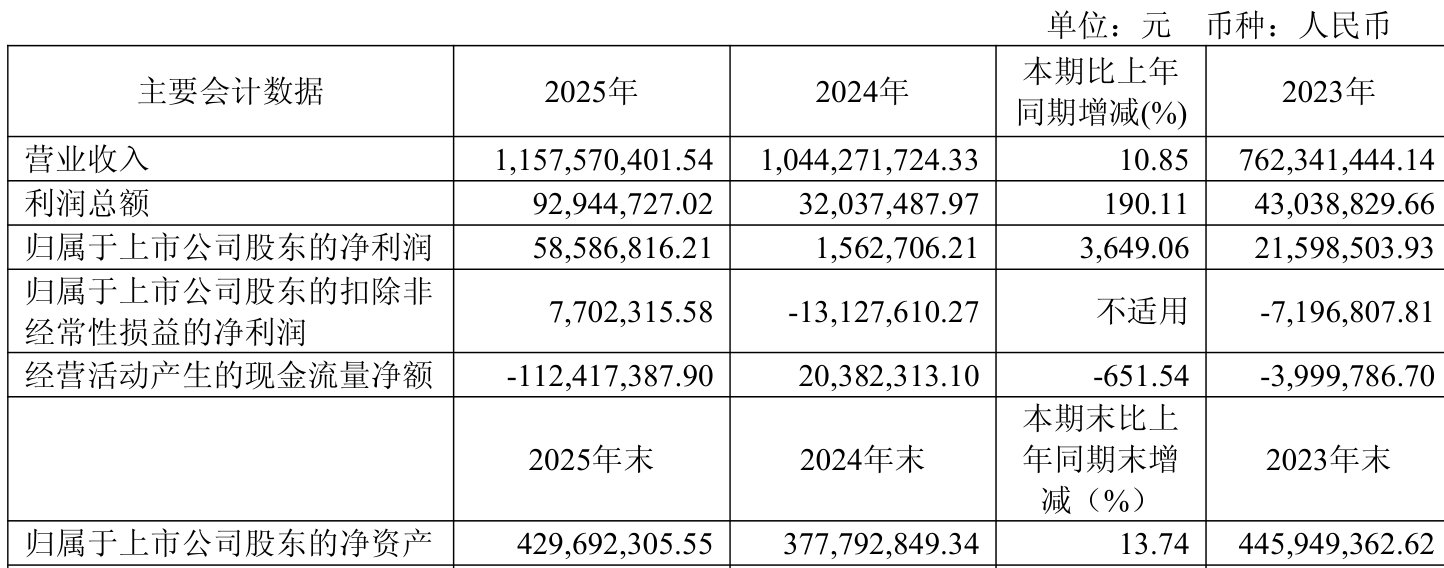 中证智能财讯宁波富邦(600768)4月13日披露2025年年度报告。2025年,公司实现营业总收入11.58亿元,同比增长10.85%;归母净利润5858.68万元,同比增长3649.06%;扣非净利润770.23万元,同比扭亏;经营活动产生的现金流量净额为-1.12亿元,上年同期为2038.23万元;报告期内,宁波富邦基本每股收益为0.44元,加权平均净资产收益率为14.51%。公司2025年度分配预案为:拟向全体股东每10股派现0.5元(含税)。