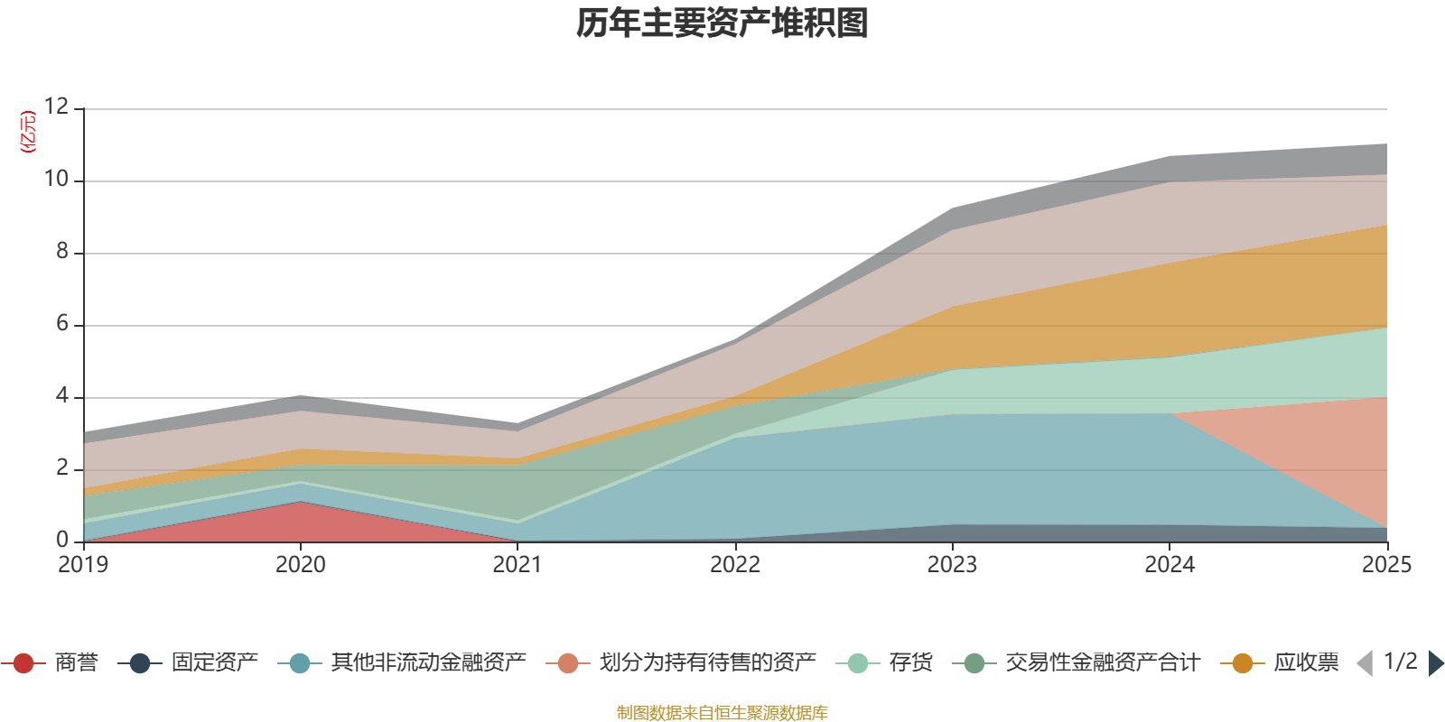 资产重大变化方面,截至2025年末,公司划分为持有待售的资产占公司总资产的32.84%,上年末为0;其他非流动金融资产较上年末减少100%,占公司总资产比重下降28.86个百分点;货币资金较上年末减少37.81%,占公司总资产比重下降8.36个百分点;存货较上年末增加24.77%,占公司总资产比重上升3.02个百分点。