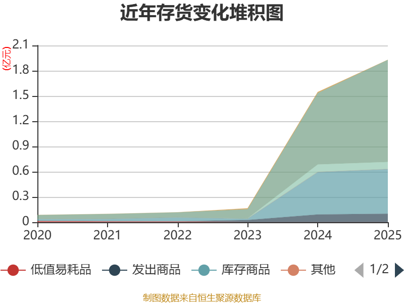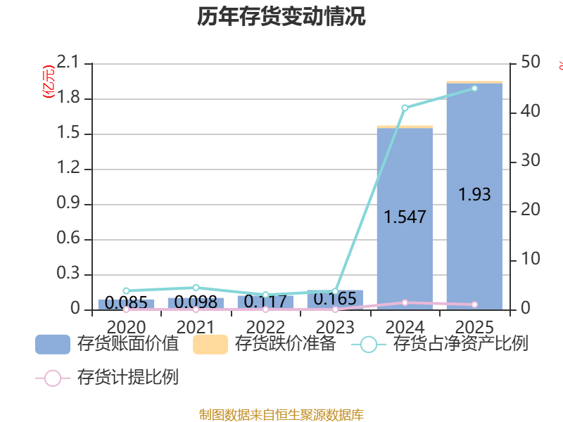 从存货变动来看,截至2025年末,公司存货账面价值为1.93亿元,占净资产的44.92%,较上年末增加3832.43万元。其中,存货跌价准备为193.44万元,计提比例为0.99%。