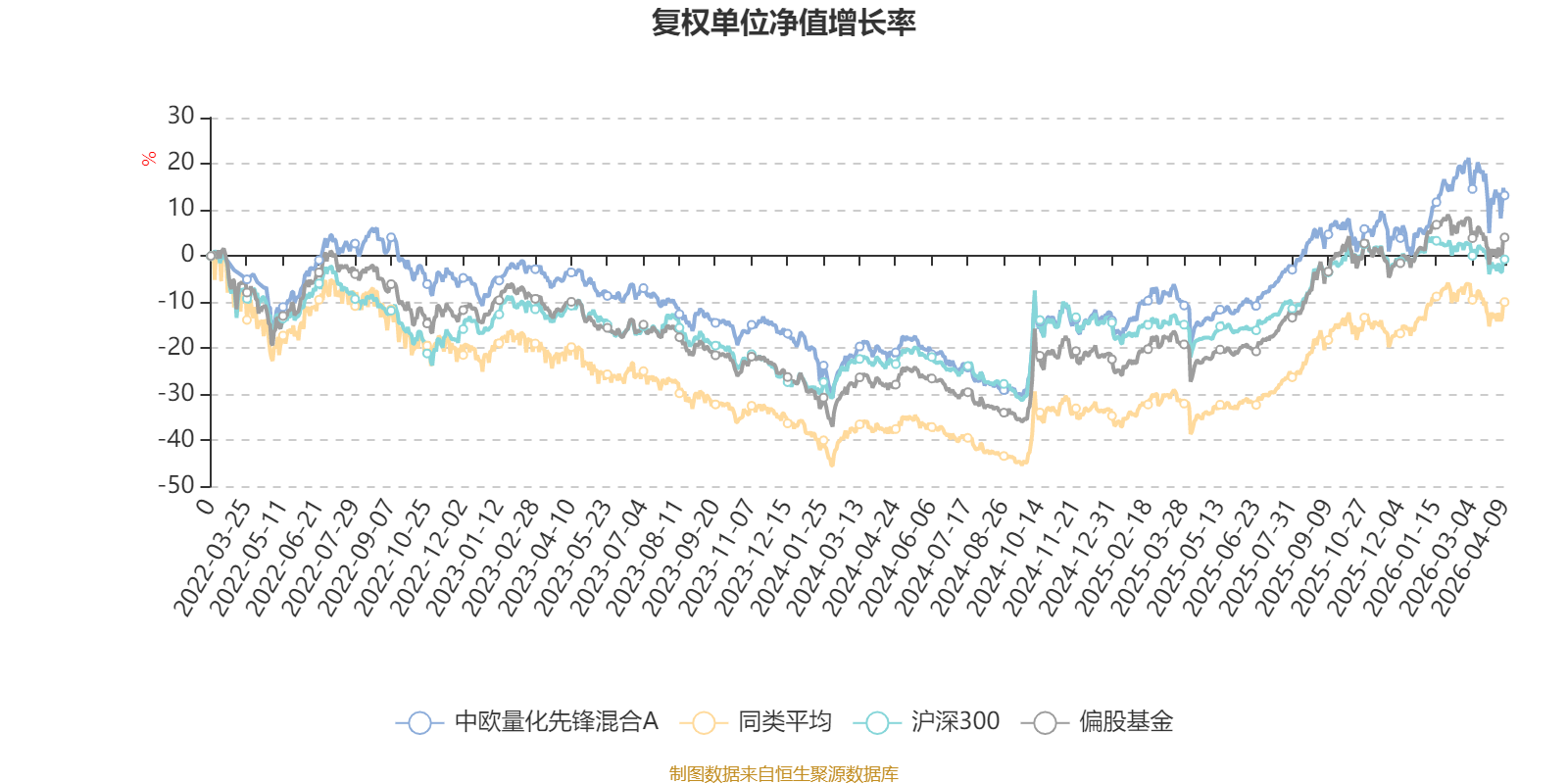 截至4月9日,中欧量化先锋混合A近三个月复权单位净值增长率为3.92%,位于同类可比基金126/621;近半年复权单位净值增长率为4.72%,位于同类可比基金205/621;近一年复权单位净值增长率为36.14%,位于同类可比基金330/618;近三年复权单位净值增长率为16.30%,位于同类可比基金270/559。