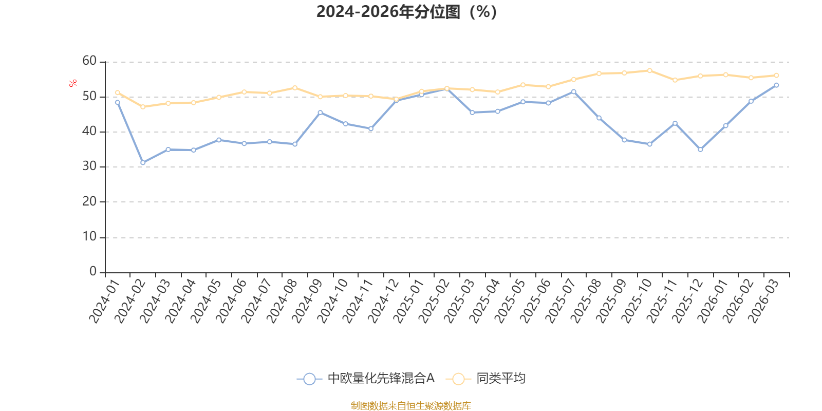 通过所选区间该基金净值增长率分位图,可以观察该基金与同类基金业绩比较情况。图为坐标原点到区间内某时点的净值增长率在同类基金中的分位数。
