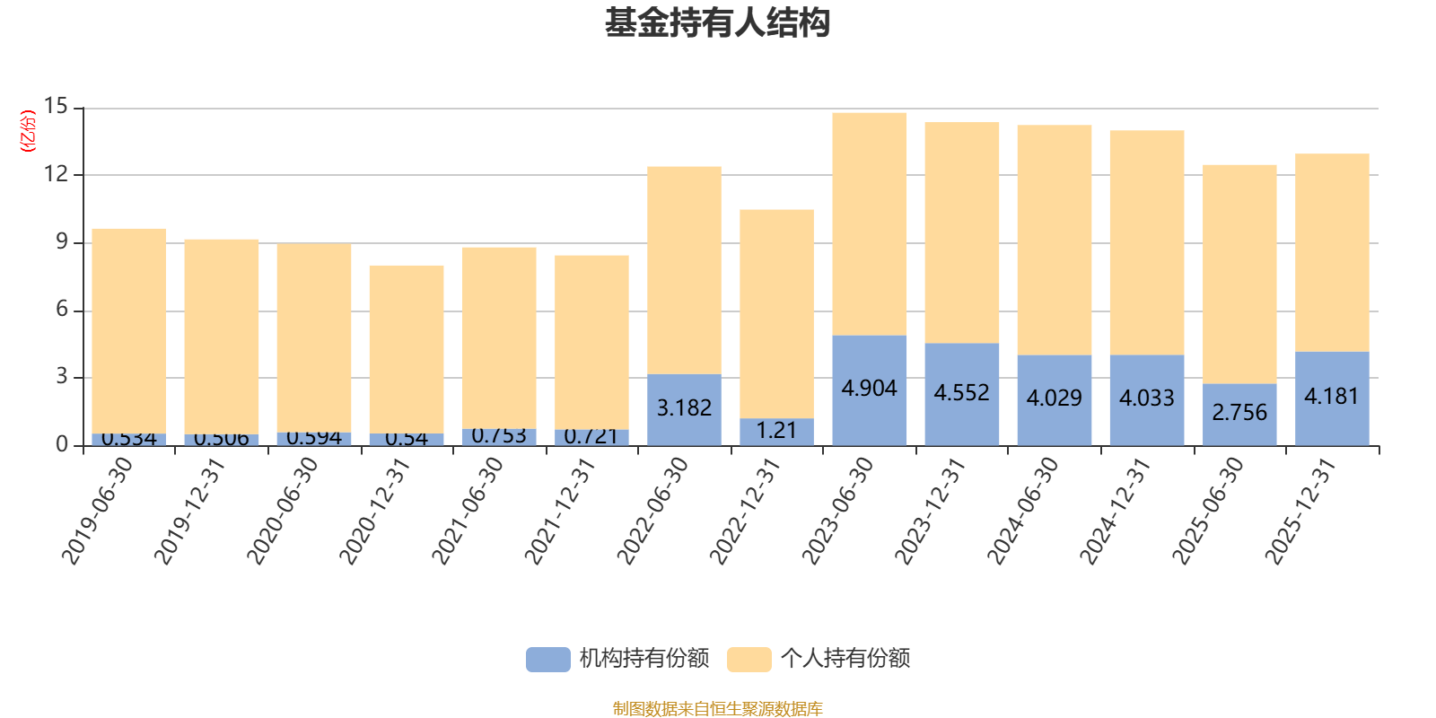 截至2025年12月31日,基金持有人共计2.68万户,合计持有12.96亿份。其中管理人员工持有31.59万份,占比0.02%,机构持有份额占比32.26%,个人投资者占比67.74%。