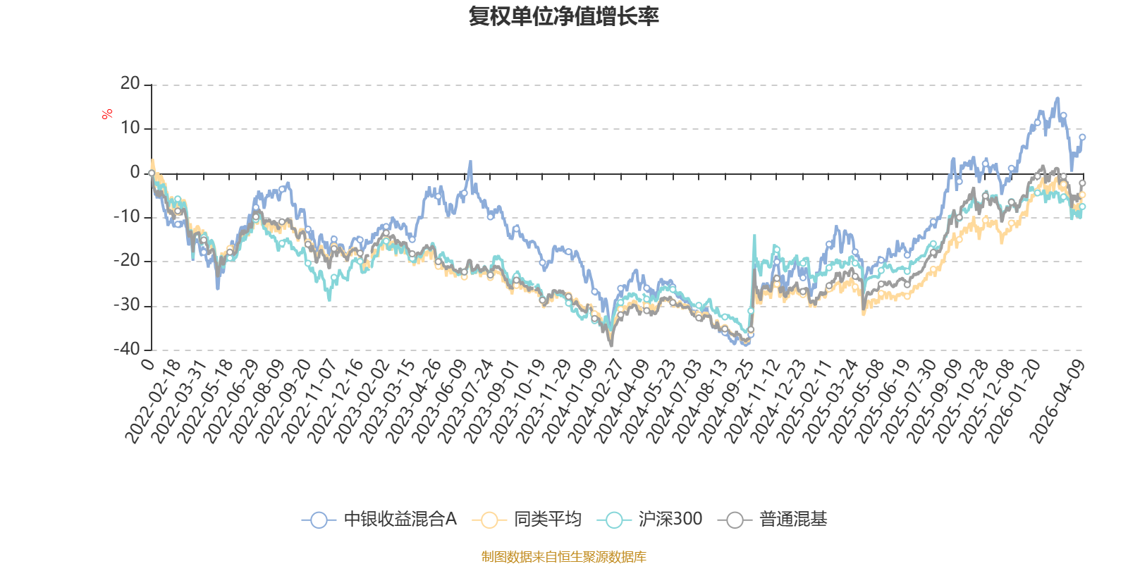 截至4月9日,中银收益混合A近三个月复权单位净值增长率为-2.09%,位于同类可比基金82/134;近半年复权单位净值增长率为4.18%,位于同类可比基金56/134;近一年复权单位净值增长率为43.70%,位于同类可比基金37/134;近三年复权单位净值增长率为12.65%,位于同类可比基金67/126。