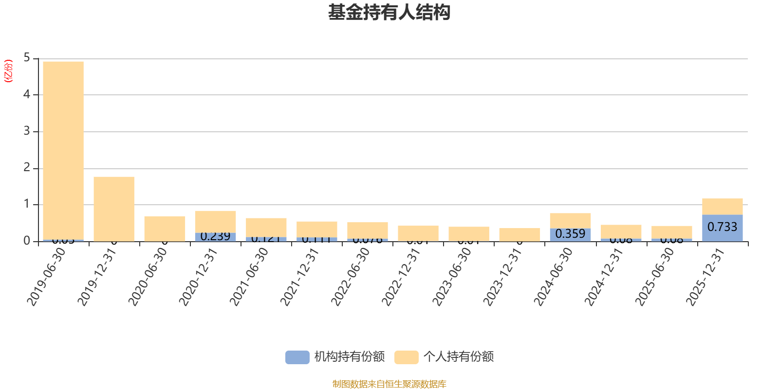 截至2025年12月31日,基金持有人共计1685户,合计持有1.17亿份。其中管理人员工持有8384.23份,占比0.01%,机构持有份额占比62.46%,个人投资者占比37.54%。