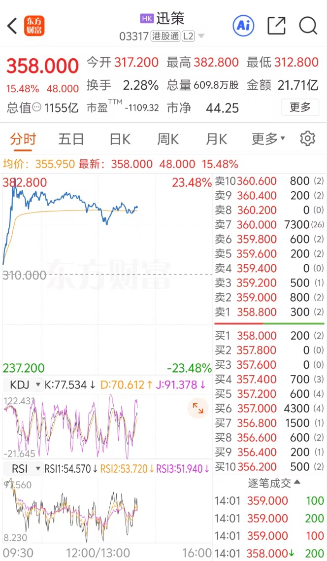 上证报中国证券网讯4月13日,迅策盘中一度涨超23%,最高报382.8港元/股。截至14时01分,迅策涨15.48%,报358港元/股。
