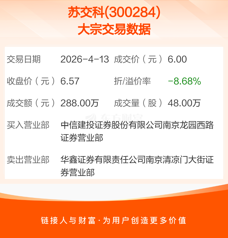 2026年4月13日,苏交科发生1笔大宗交易,共成交48.00万股,成交金额288.00万元,占其流通市值比例为0.04%。