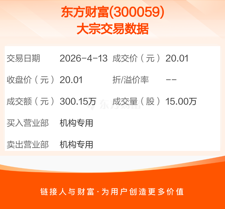 2026年4月13日,东方财富发生1笔大宗交易,共成交15.00万股,成交金额300.15万元。