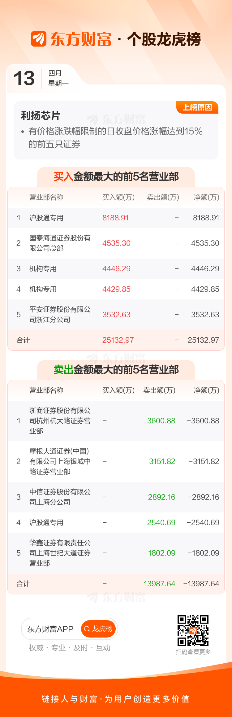 交易所2026年4月13日公布的交易公开信息显示,利扬芯片因成为有价格涨跌幅限制的日收盘价格涨幅达到15%的前五只证券上榜。利扬芯片当日收报35.63元,涨跌幅20.01%,偏离值20.01%,换手率16.94%,成交额13.76亿。