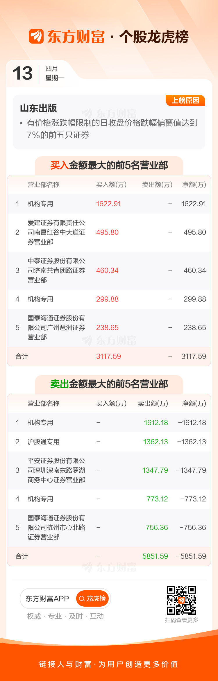 交易所2026年4月13日公布的交易公开信息显示,山东出版因成为有价格涨跌幅限制的日收盘价格跌幅偏离值达到7%的前五只证券上榜。山东出版当日收报8.33元,涨跌幅-9.95%,偏离值-10.01%,换手率1.03%,成交额1.79亿。