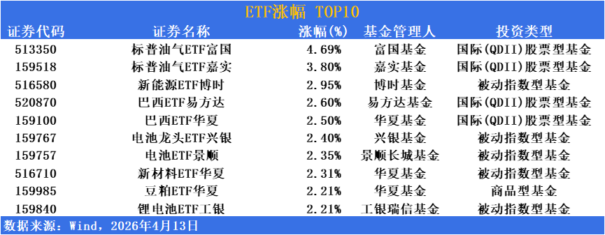 涨幅方面,油气主题ETF强势领涨,标普油气ETF富国涨幅4.69%