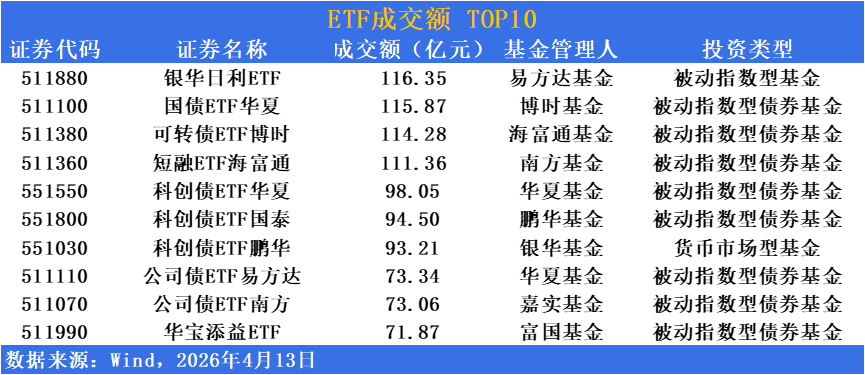 科创债主题产品成交热度高企,科创债ETF华夏(551550)成交98.05亿元,科创债ETF国泰(551800)成交94.50亿元,科创债ETF鹏华(551030)成交93.21亿元;公司债ETF易方达(511110)成交73.34亿元,公司债ETF南方(511070)成交73.06亿元,华宝添益ETF(511990)成交71.87亿元,跨市场债券工具流动性优势凸显。