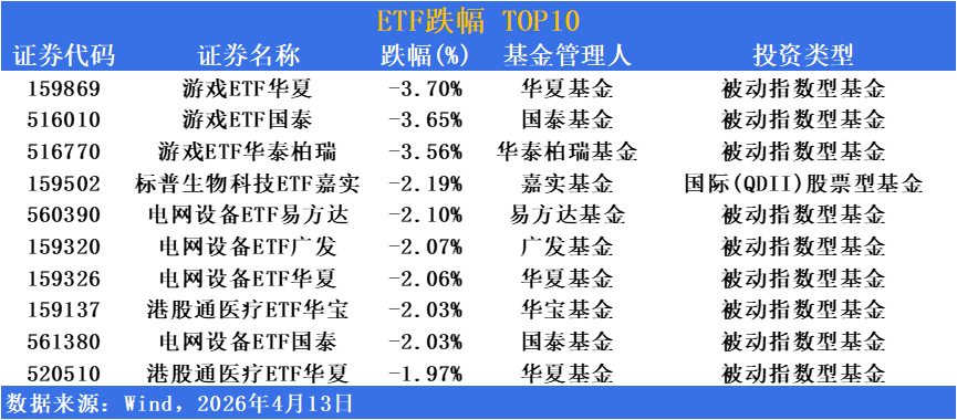 受AI应用端炒作降温及游戏行业监管预期升温影响,游戏板块遭遇集中获利了结,领跌ETF市场。三只游戏相关产品包揽跌幅榜前三。