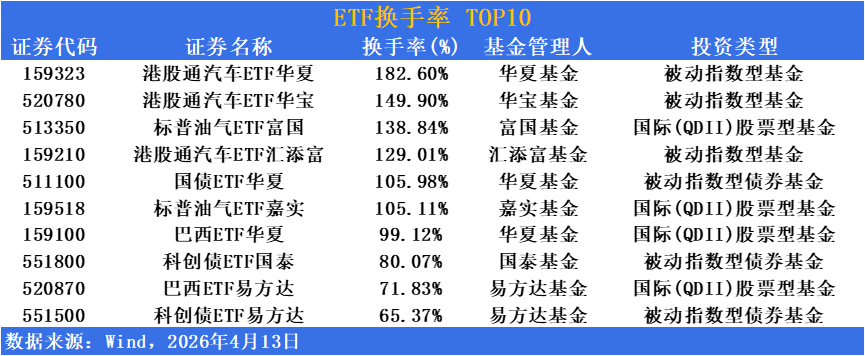 跨境QDII品种持续活跃,标普油气ETF富国(513350)换手率138.84%,标普油气ETF嘉实(159518)换手率105.11%,受益于能源价格波动及海外资产配置需求;巴西ETF华夏(159100)换手率99.12%,巴西ETF易方达(520870)换手率71.83%,新兴市场工具同样受到短线资金青睐。