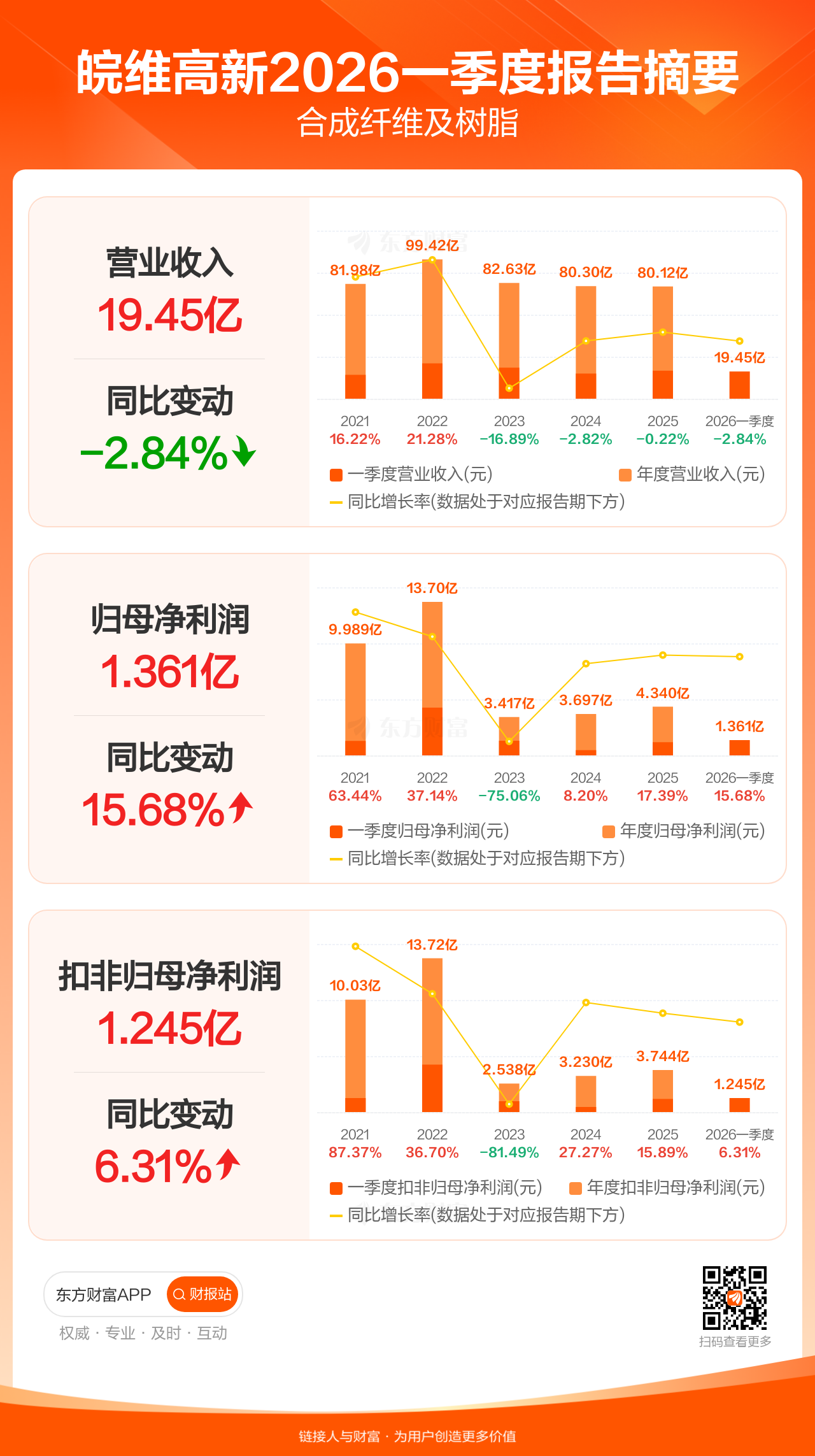 皖维高新4月14日发布2026年一季报显示,公司一季度实现营业收入19.45亿元,同比下滑2.84%;归母净利润1.36亿元,同比增长15.68%;扣非归母净利润1.24亿元,同比增长6.31%。