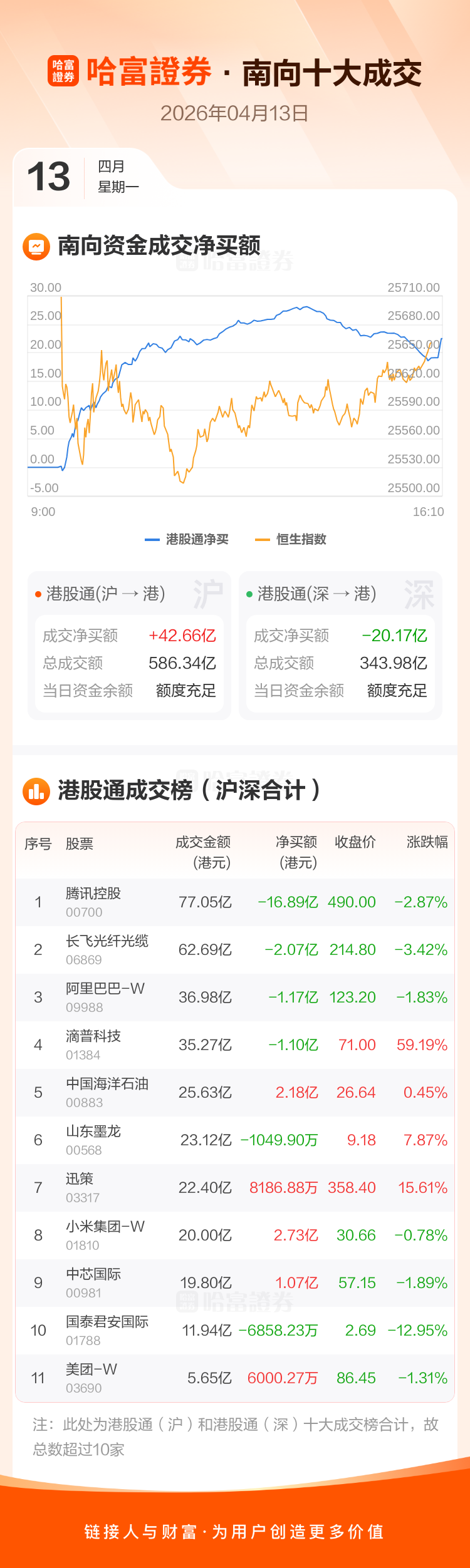 恒生指数4月13日跌0.9%,收报25660.85点。南向资金今日净买入港股22.49亿港元。南向资金今日成交额930.32亿港元,港股大市成交2079.09亿港元。