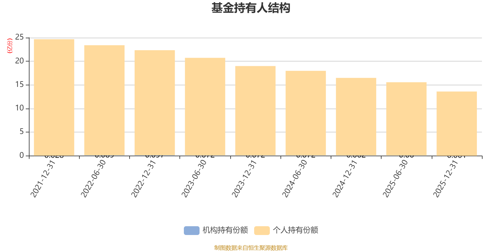 截至2025年12月31日,基金持有人共计1.41万户,合计持有13.6亿份。其中管理人员工持有128.86万份,占比0.09%,机构持有份额占比0.01%,个人投资者占比99.99%。