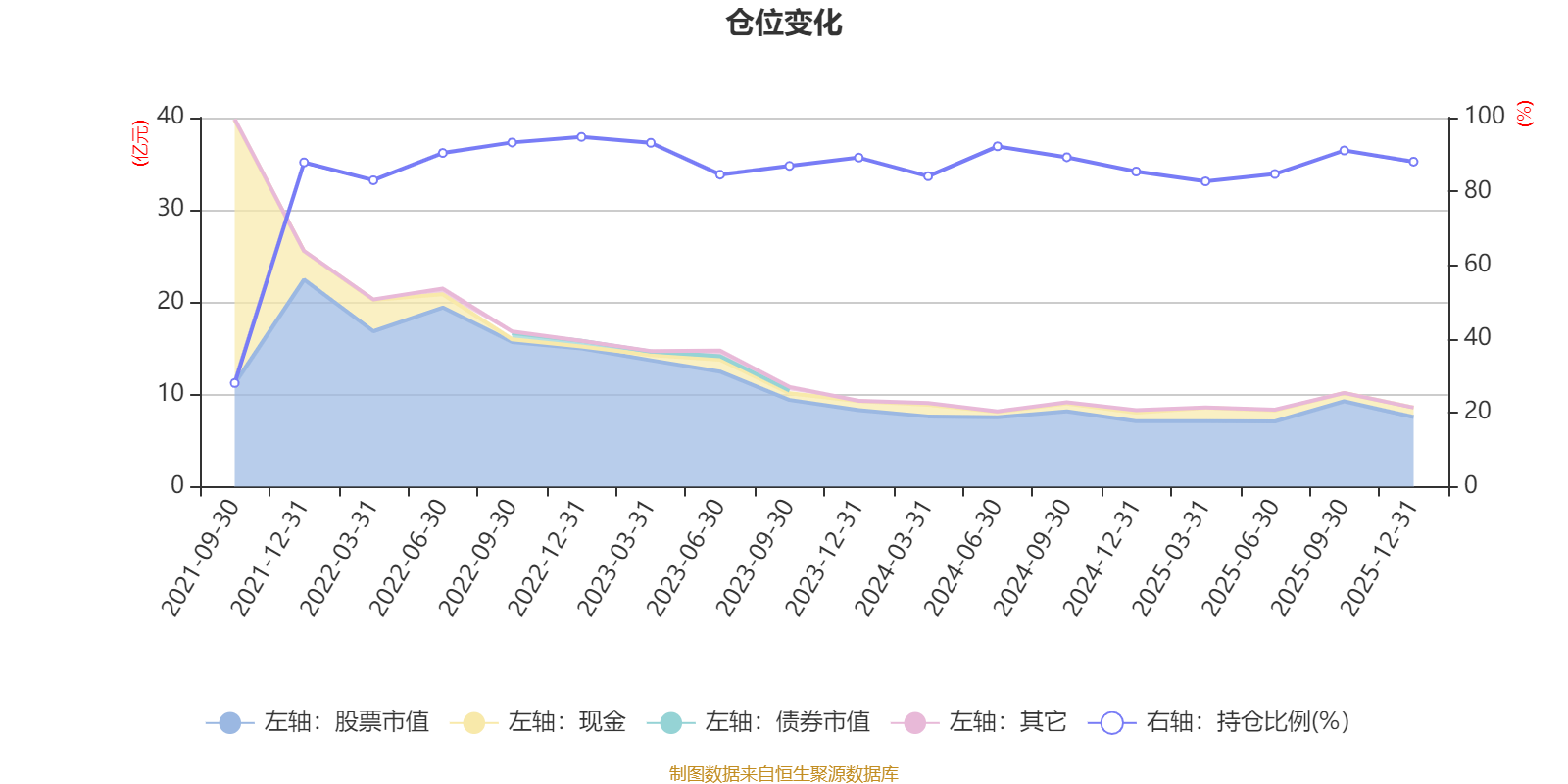 据定期报告数据统计,近三年平均股票仓位为87.61%,同类平均为86.9%。2022年末基金达到94.76%的最高仓位,2021年三季度末最低,为28.06%。