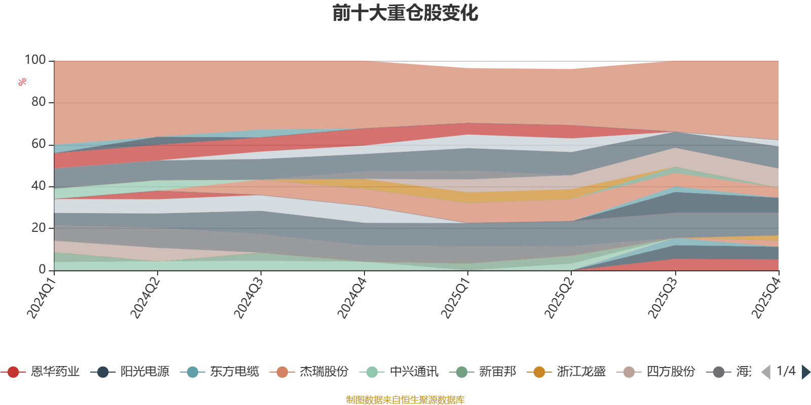 该基金持股集中度较高。截至2025年末,基金十大重仓股分别是宁德时代、豪迈科技、腾讯控股、爱旭股份、阳光电源、恩华药业、敏实集团、美的集团、杰瑞股份、浙江龙盛。