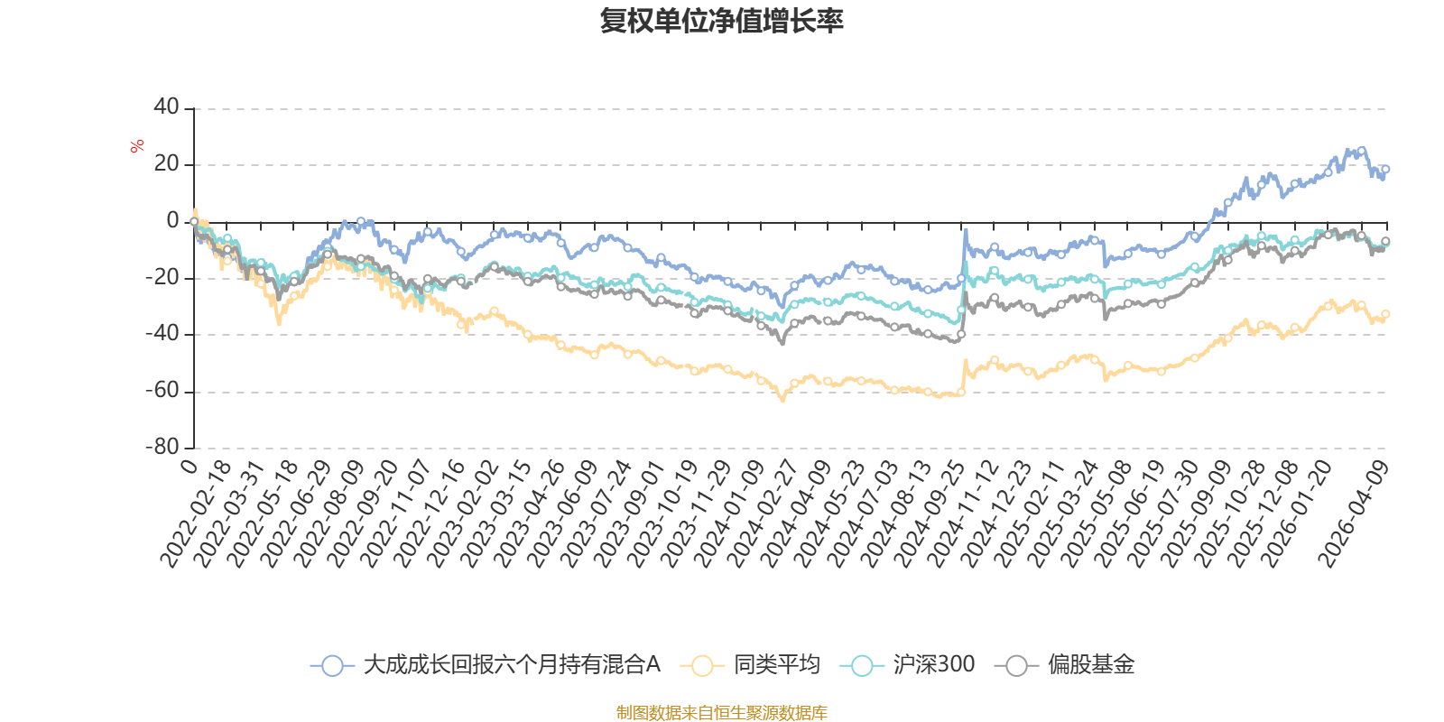 截至4月9日,大成成长回报六个月持有混合A近三个月复权单位净值增长率为2.22%,位于同类可比基金21/100;近半年复权单位净值增长率为2.31%,位于同类可比基金34/100;近一年复权单位净值增长率为40.07%,位于同类可比基金59/99;近三年复权单位净值增长率为23.09%,位于同类可比基金27/76。