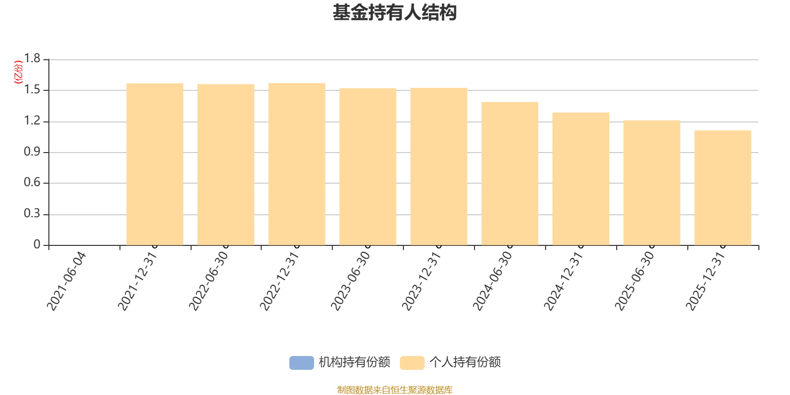 截至2025年12月31日,基金持有人共计1.32万户,合计持有1.11亿份。其中管理人员工持有5722.32份,占比0.01%,机构持有份额占比0.00%,个人投资者占比100.00%。