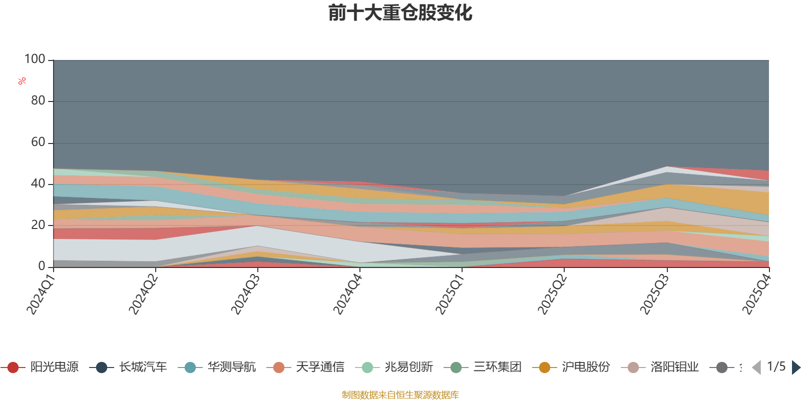 截至2025年末,基金十大重仓股分别是中际旭创、东方财富、新易盛、海光信息、比亚迪、恒瑞医药、生益科技、同花顺、阳光电源、深南电路。
