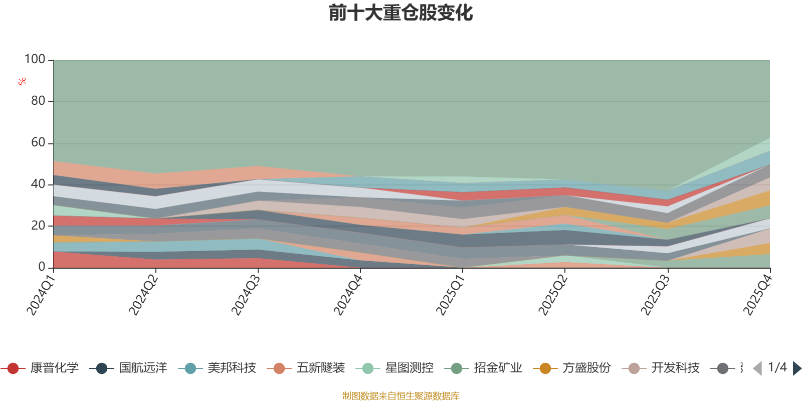 截至2025年末,基金十大重仓股分别是民士达、开发科技、纳科诺尔、招金矿业、苏轴股份、奥迪威、戈碧迦、万通液压、方盛股份、开特股份。