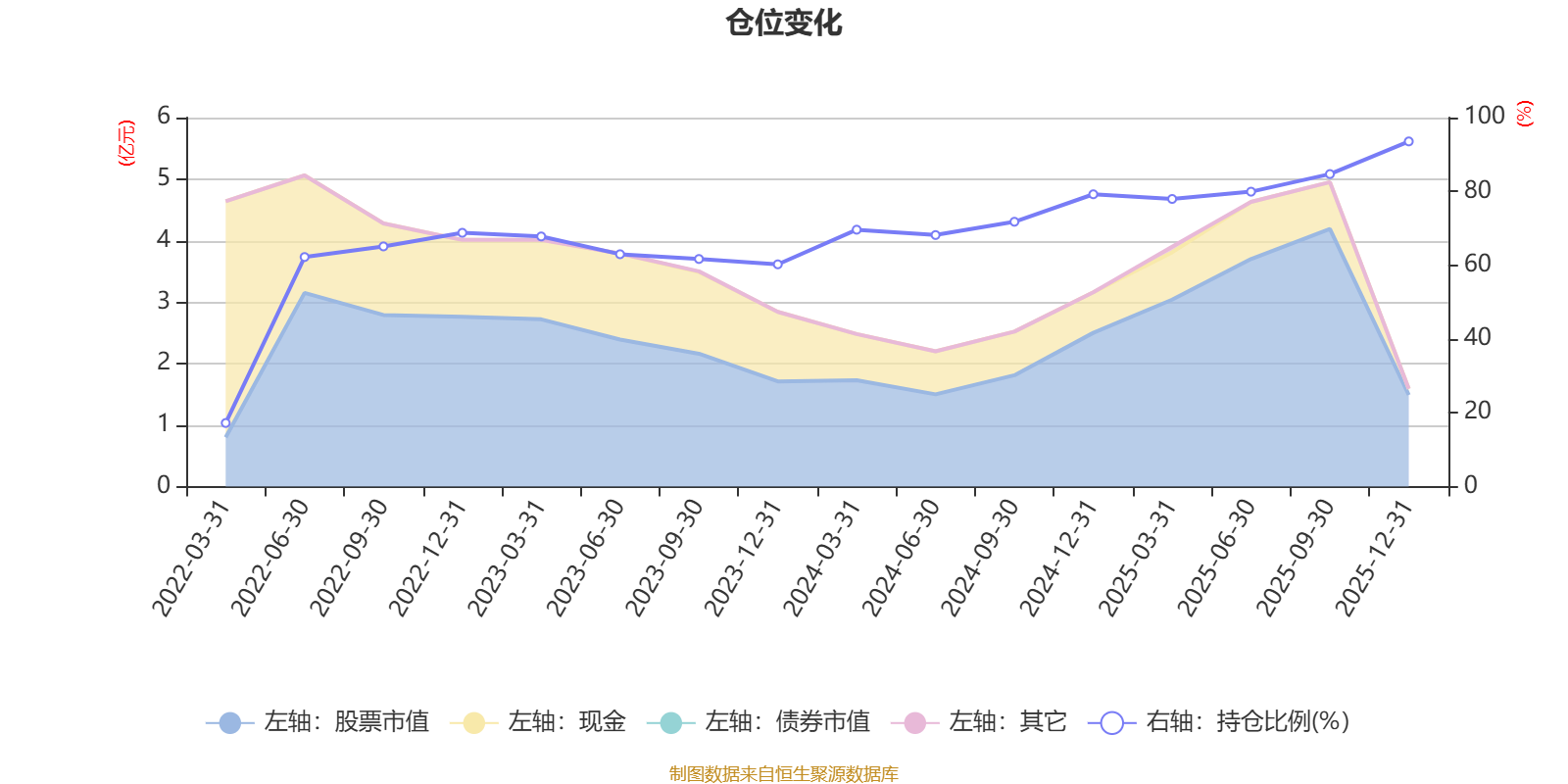 据定期报告数据统计,近三年平均股票仓位为73.13%,同类平均为85.83%。2025年末基金达到93.55%的最高仓位,2022年一季度末最低,为17.23%。