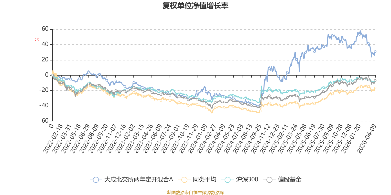 截至4月9日,大成北交所两年定开混合A近三个月复权单位净值增长率为-13.90%,位于同类可比基金597/621;近半年复权单位净值增长率为-11.64%,位于同类可比基金559/621;近一年复权单位净值增长率为11.38%,位于同类可比基金557/618;近三年复权单位净值增长率为58.08%,位于同类可比基金48/559。