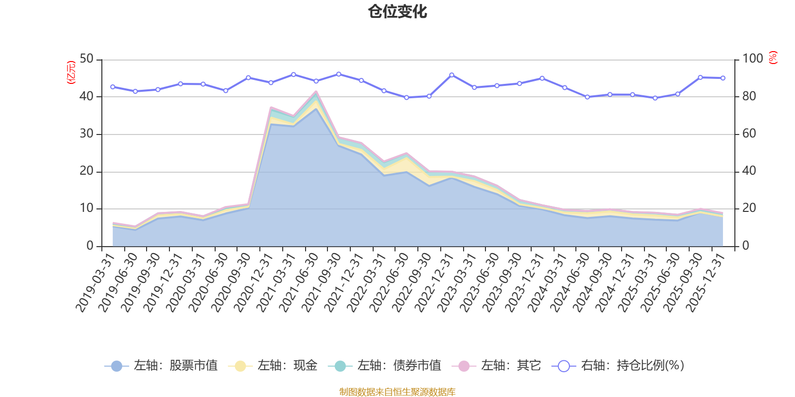 据定期报告数据统计,近三年平均股票仓位为84.77%,同类平均为86.12%。2021年三季度末基金达到92.2%的最高仓位,2025年一季度末最低,为79.39%。