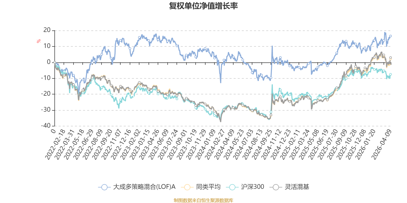 截至4月9日,大成多策略混合(LOF)A近三个月复权单位净值增长率为4.21%,位于同类可比基金217/1287;近半年复权单位净值增长率为5.37%,位于同类可比基金411/1286;近一年复权单位净值增长率为25.30%,位于同类可比基金775/1286;近三年复权单位净值增长率为-0.20%,位于同类可比基金972/1286。