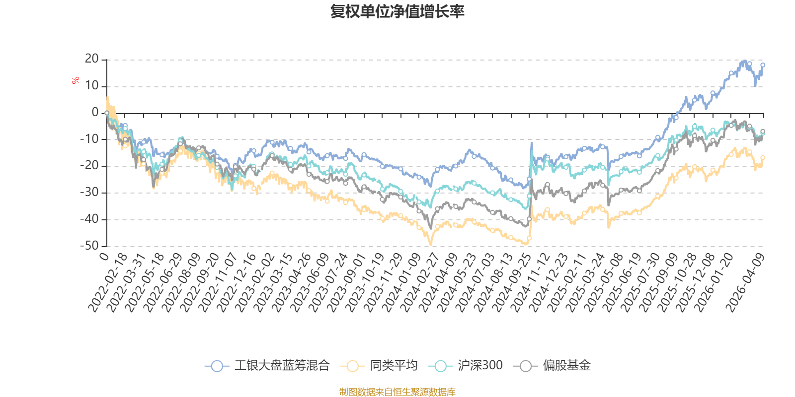 截至4月9日,工银大盘蓝筹混合近三个月复权单位净值增长率为4.49%,位于同类可比基金104/621;近半年复权单位净值增长率为11.12%,位于同类可比基金86/621;近一年复权单位净值增长率为48.01%,位于同类可比基金216/618;近三年复权单位净值增长率为33.99%,位于同类可比基金143/559。