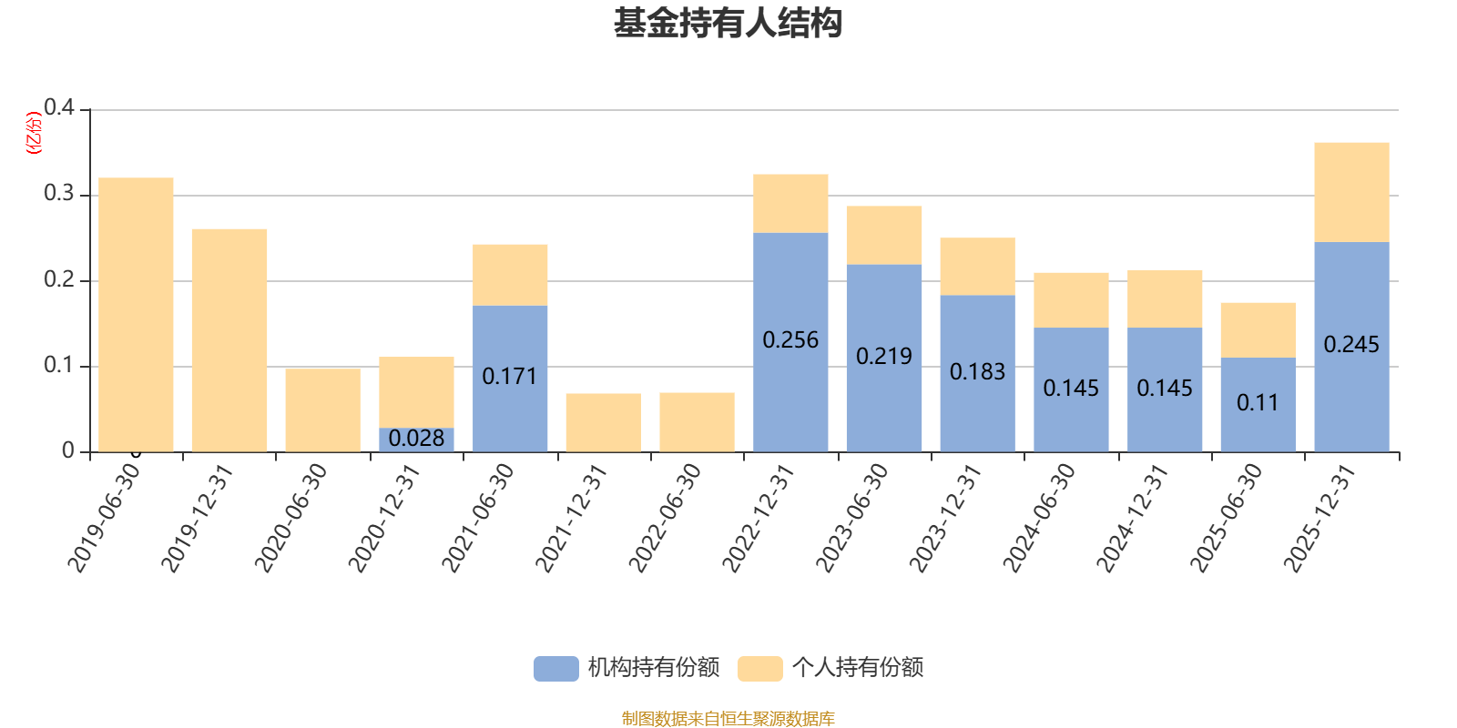 截至2025年12月31日,基金持有人共计370户,合计持有3604.61万份。其中管理人员工持有5.54万份,占比0.15%,机构持有份额占比67.90%,个人投资者占比32.10%。