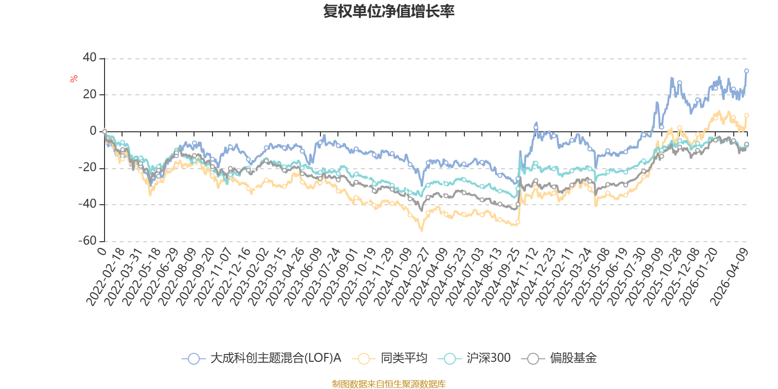 截至4月9日,大成科创主题混合(LOF)A近三个月复权单位净值增长率为6.76%,位于同类可比基金64/229;近半年复权单位净值增长率为2.59%,位于同类可比基金123/229;近一年复权单位净值增长率为61.37%,位于同类可比基金129/229;近三年复权单位净值增长率为43.46%,位于同类可比基金87/171。