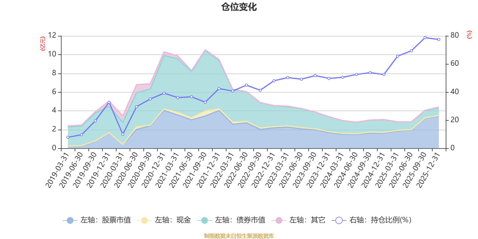 据定期报告数据统计,近三年平均股票仓位为58.45%,同类平均为72.57%。2025年三季度末基金达到78.74%的最高仓位,2019年一季度末最低,为7.84%。