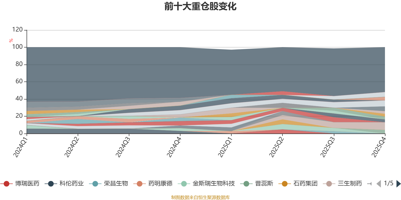 截至2025年末,基金十大重仓股分别是三生制药、科伦博泰生物-B、百利天恒、映恩生物-B、普蕊斯、联影医疗、新诺威、先声药业、康诺亚-B、泽璟制药。