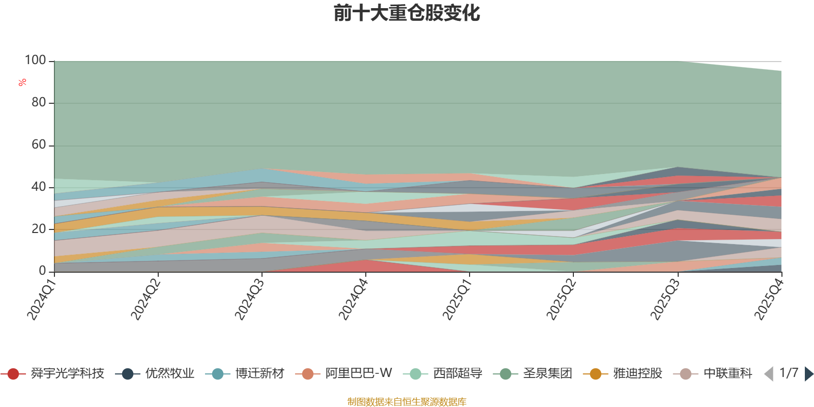 截至2025年末,基金十大重仓股分别是东鹏饮料、极兔速递-W、盐湖股份、中国平安、中联重科、中国太保、宁德时代、博迁新材、优然牧业、东方证券。