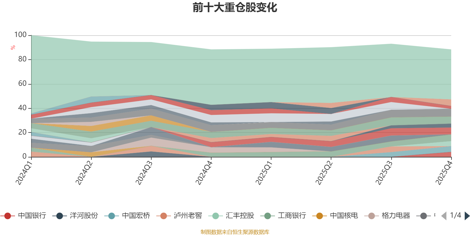 截至2025年末,基金十大重仓股分别是美的集团、长江电力、宇通客车、工商银行、建设银行、中国宏桥、汇丰控股、中国银行、中国平安、中国神华。