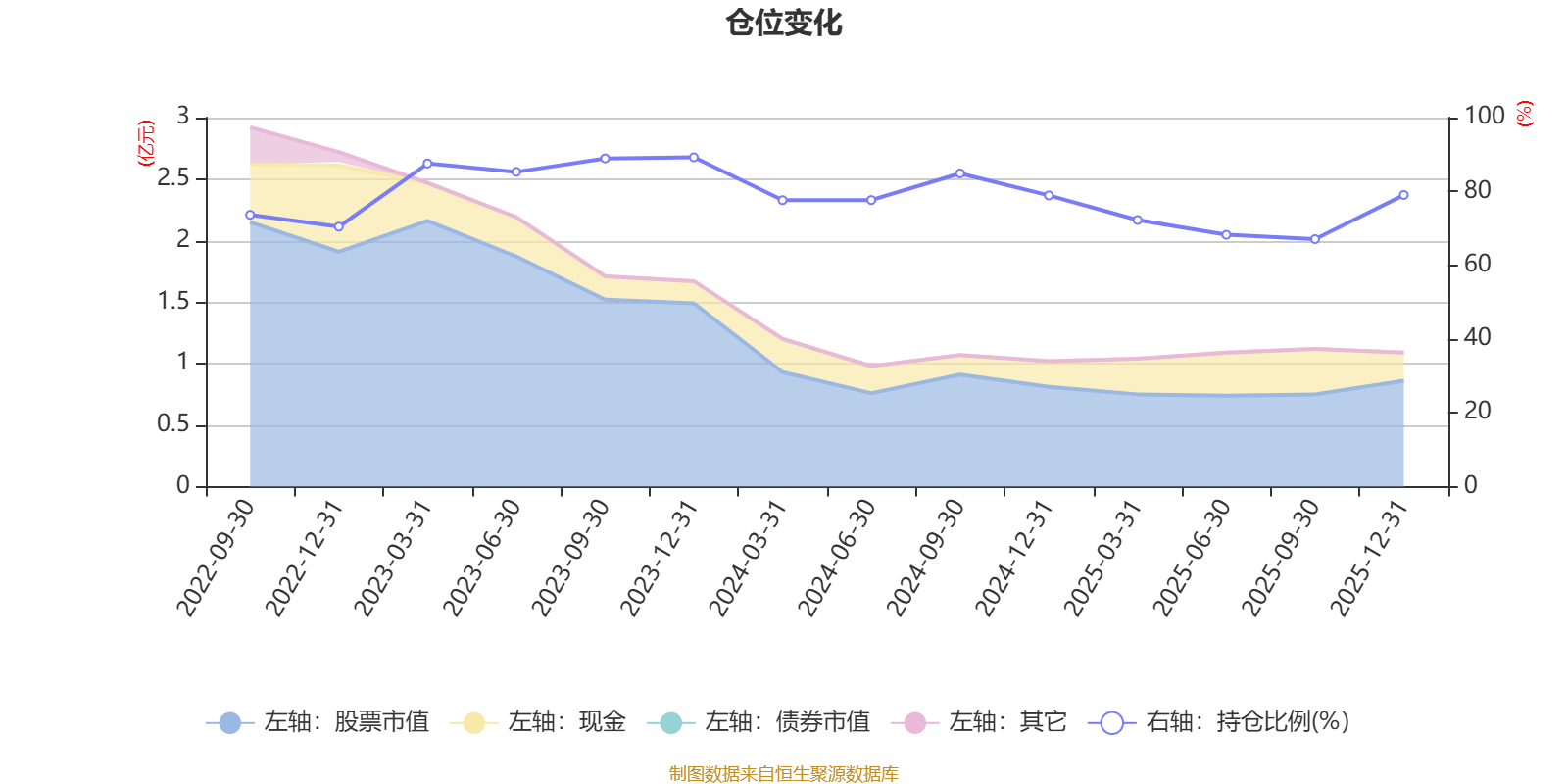 据定期报告数据统计,近三年平均股票仓位为79.72%,同类平均为84.04%。2023年末基金达到89.24%的最高仓位,2025年三季度末最低,为67.07%。