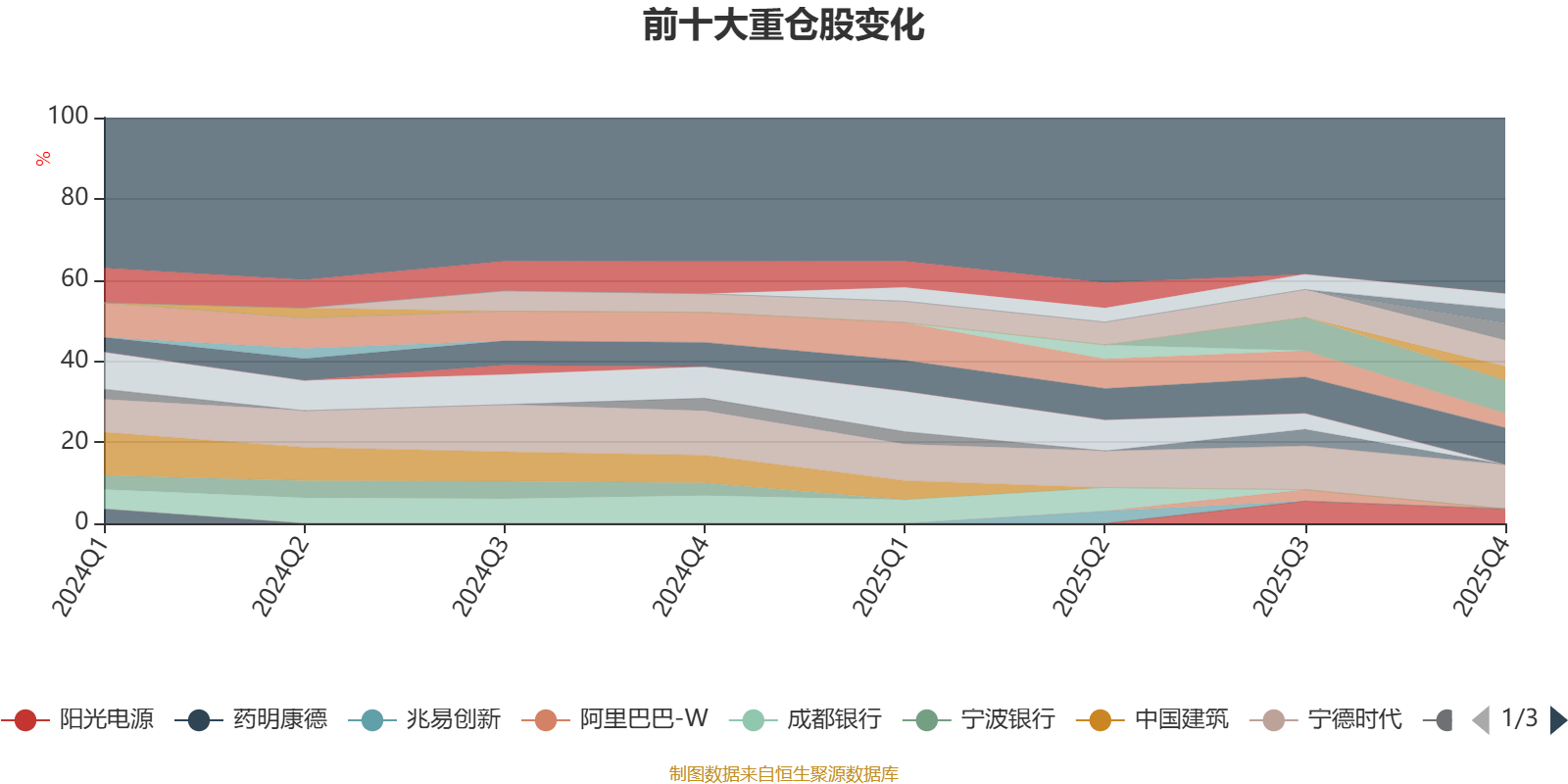 该基金持股集中度较高。截至2025年末,基金十大重仓股分别是宁德时代、腾讯控股、立讯精密、恒瑞医药、中国人寿、海光信息、阳光电源、招商蛇口、新华保险、中国铝业。