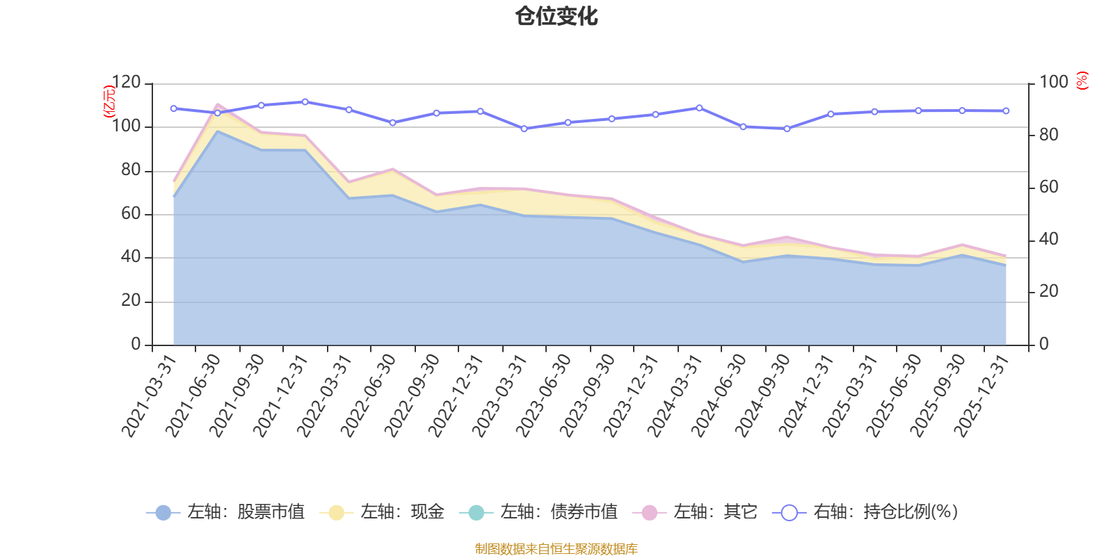 据定期报告数据统计,近三年平均股票仓位为87.11%,同类平均为86.17%。2021年末基金达到92.96%的最高仓位,2023年一季度末最低,为82.68%。