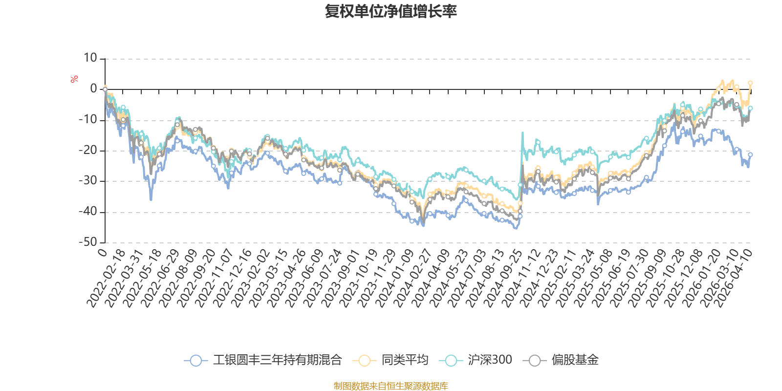 截至4月10日,工银圆丰三年持有期混合近三个月复权单位净值增长率为-9.25%,位于同类可比基金127/130;近半年复权单位净值增长率为-8.60%,位于同类可比基金119/130;近一年复权单位净值增长率为21.09%,位于同类可比基金98/130;近三年复权单位净值增长率为3.99%,位于同类可比基金93/126。
