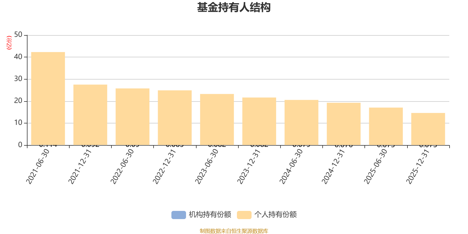 截至2025年12月31日,基金持有人共计2.36万户,合计持有14.65亿份。其中管理人员工持有128.78万份,占比0.09%,机构持有份额占比0.50%,个人投资者占比99.50%。