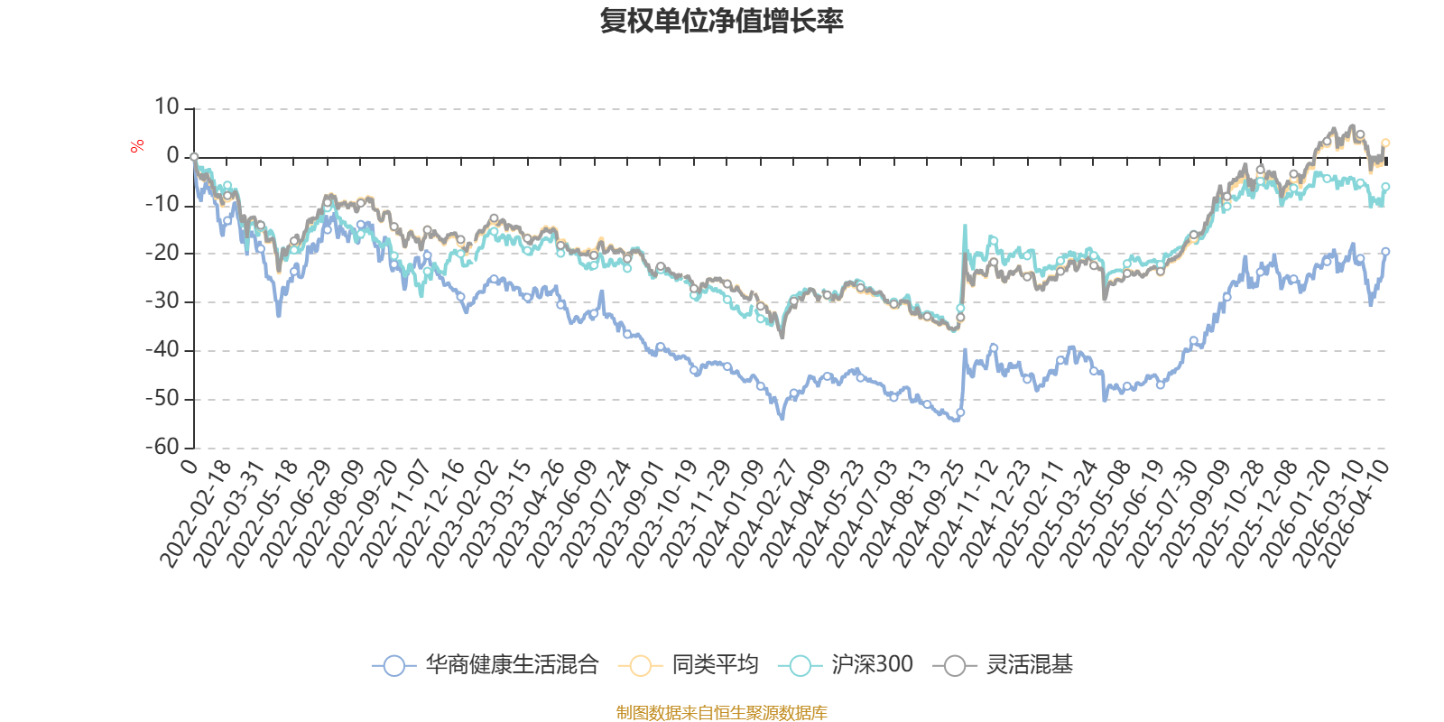 截至4月10日,华商健康生活混合近三个月复权单位净值增长率为3.55%,位于同类可比基金300/1287;近半年复权单位净值增长率为5.12%,位于同类可比基金560/1286;近一年复权单位净值增长率为54.35%,位于同类可比基金302/1286;近三年复权单位净值增长率为12.62%,位于同类可比基金704/1286。