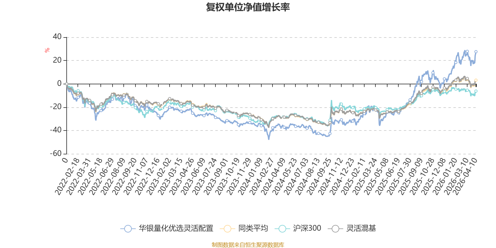 截至4月10日,华银量化优选灵活配置近三个月复权单位净值增长率为11.61%,位于同类可比基金83/1287;近半年复权单位净值增长率为17.82%,位于同类可比基金164/1286;近一年复权单位净值增长率为88.70%,位于同类可比基金108/1286;近三年复权单位净值增长率为64.20%,位于同类可比基金100/1286。